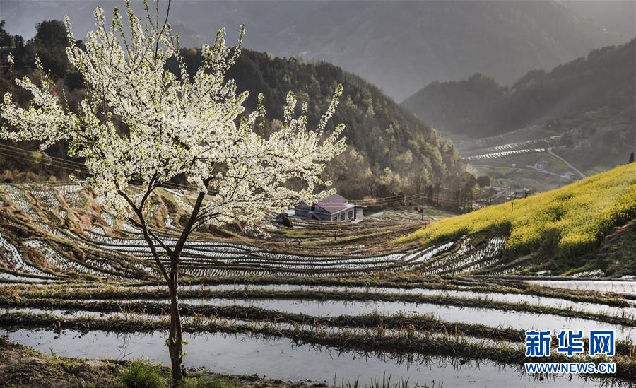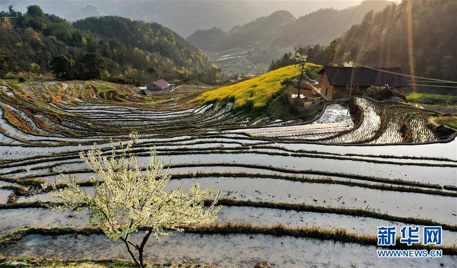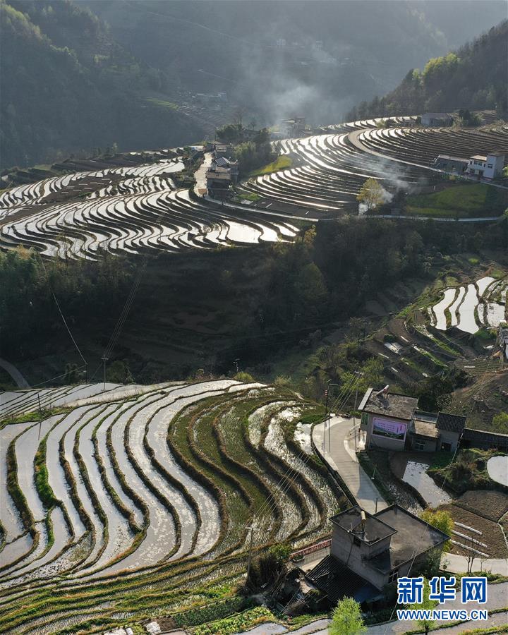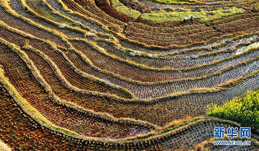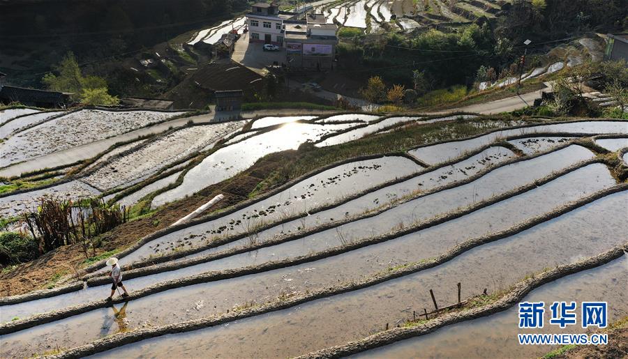 3月20日,岚皋县桂花村村民在古梯田备耕(无人机照片)。在陕西省安康市岚皋县南宫山镇桂花村,千亩古梯田倒映蓝天青山,构成一幅秀美的山水画卷。 新华社记者 陶明 摄