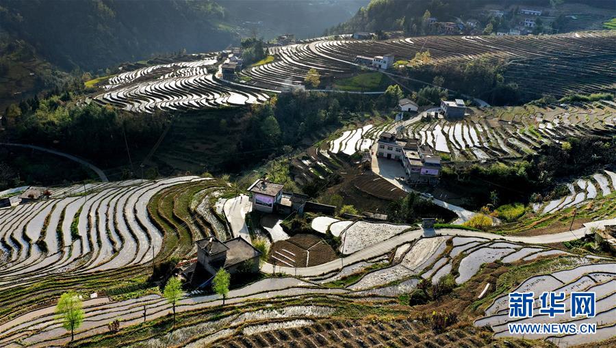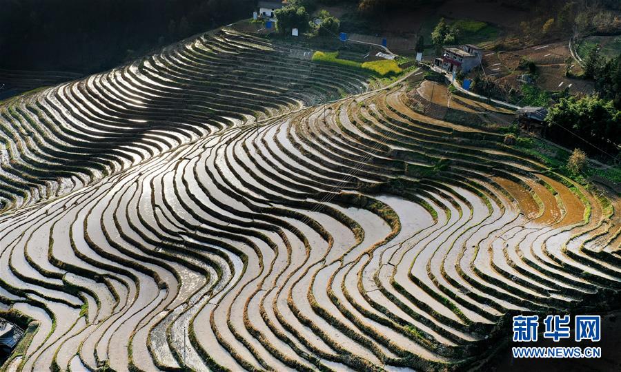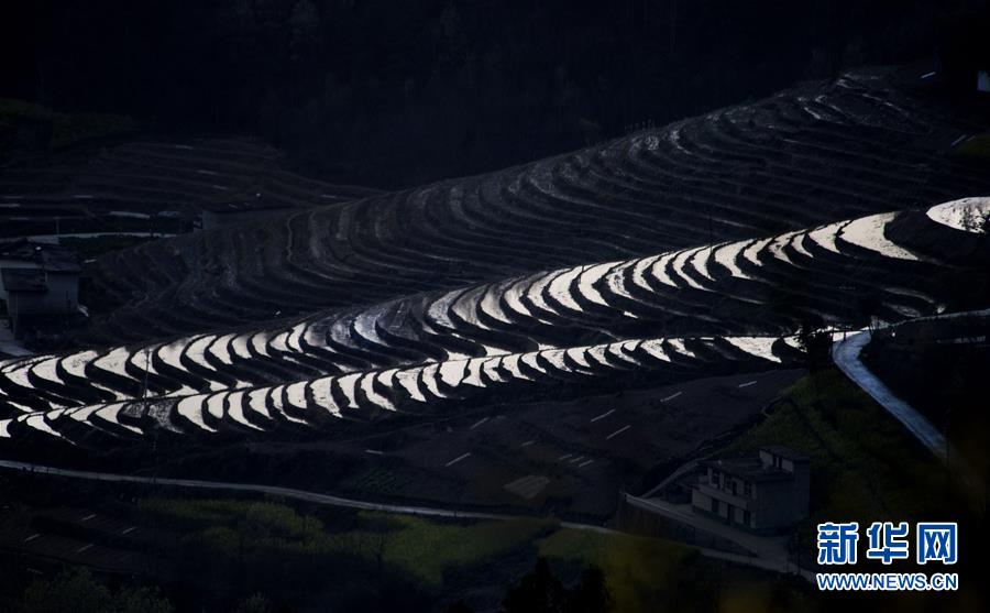 夕阳下的岚皋县桂花村古梯田(3月20日摄)。在陕西省安康市岚皋县南宫山镇桂花村,千亩古梯田倒映蓝天青山,构成一幅秀美的山水画卷。 新华社记者 陶明 摄