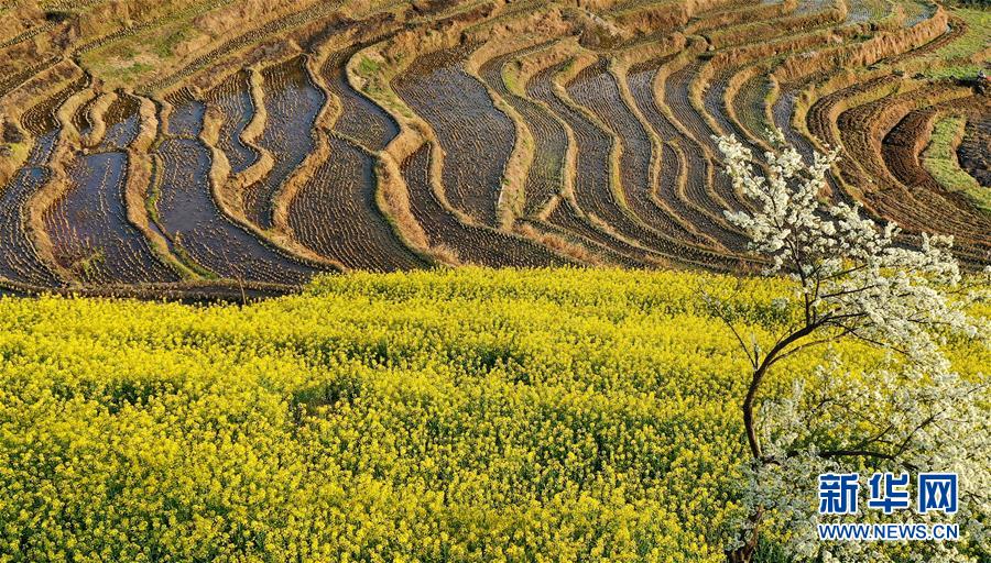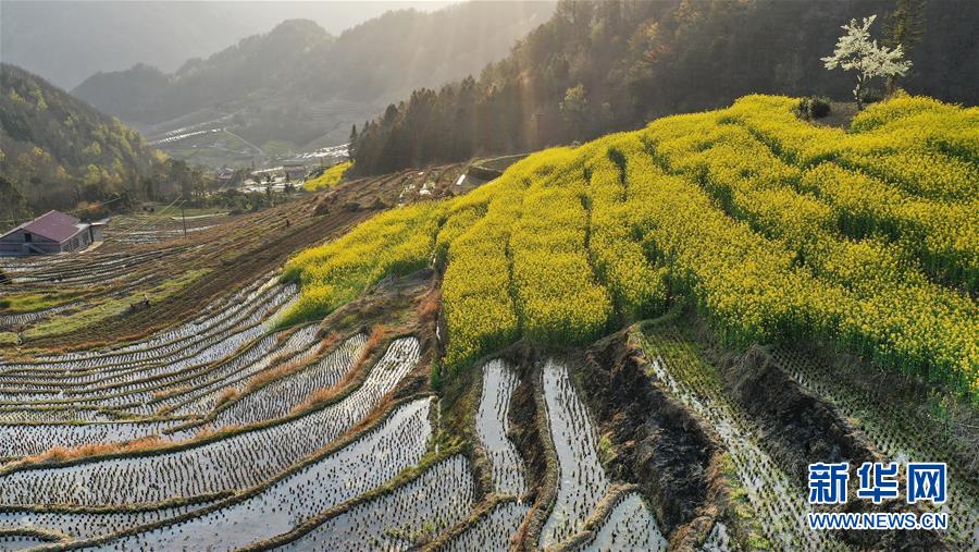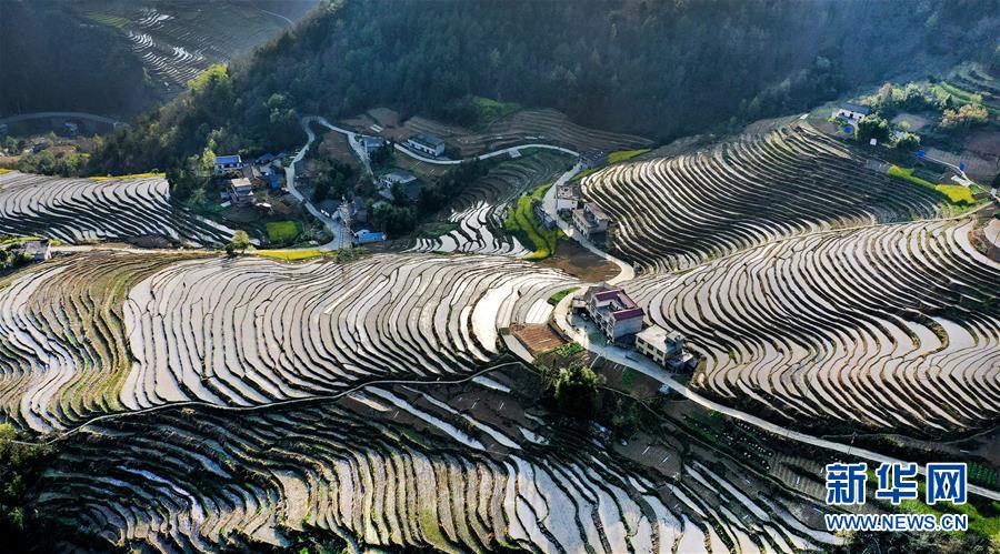 3月20日拍摄的岚皋县桂花村古梯田(无人机照片)。在陕西省安康市岚皋县南宫山镇桂花村,千亩古梯田倒映蓝天青山,构成一幅秀美的山水画卷。 新华社记者 陶明 摄