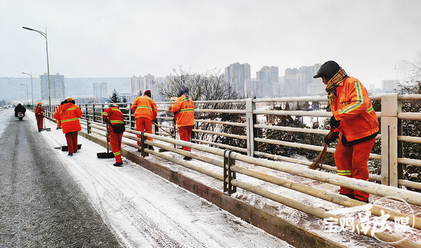 降雪后,金台区紧扣重点路段与关键节点推进除雪工作。自20日凌晨起,环卫系统干部职工提前上岗,出动12台大型除雪机械,对市区金台大道等主干道路及积雪路段进行循环清扫;10台融雪剂撒布机重点对蟠龙大桥、金渭大桥等桥梁及坡面路段撒布融雪剂35吨,有效防止路面结冰。300余名环卫工人分片包干,对路面、人行道展开拉网式清理,20日下午对蟠龙塬等积雪区域及公园游园道路持续进行清理。