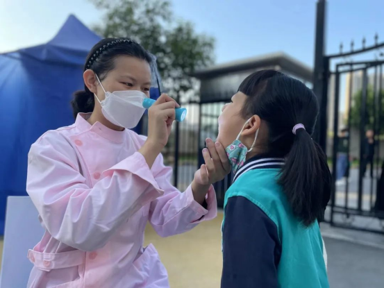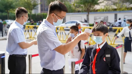 9月1日清晨,值班老师有条不紊地组织同学们在校门外有序排队,保持一米间距、戴口罩,测温入校,保障师生的健康安全。