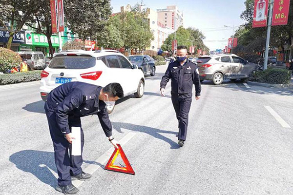25日下午13时许,二中队交警张涛、杨鹏在巡逻至梁州路与兴汉路十字路口时发现一小汽车和三轮车相撞,导致三轮车挡风玻璃破碎,造成路口小范围拥堵。张涛留在现场疏导交通,并协助当事人联系事故科和保险公司,杨鹏迅速赶回距离事故现场50米的中队营区寻求支援。指导员王渤立即安排内勤杜鑫组织崔志峰、徐永杰、王颢树等人拿上清扫工具将路面破碎的玻璃打扫干净,以便其他车辆安全通行,直至交通恢复正常才离开事故现场。