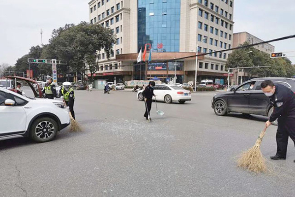 玻璃碎满地,交警来清扫。