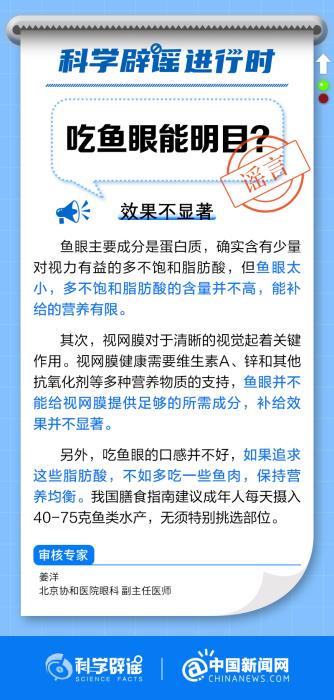 中新网10月26日电 鱼眼的主要成分是蛋白质,含有少量对视力有益的多不饱和脂肪酸,但鱼眼太小,多不饱和脂肪酸的含量并不高,能补给的营养有限。此外,鱼眼的口感并不好,如果追求这些脂肪酸,不如多吃一些鱼肉,保持营养均衡。(来源:@科学辟谣 @中国新闻网 )