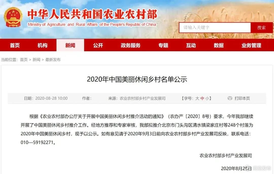 8月28日,农业农村部官网发布了2020年中国美丽休闲乡村公示名单,其中陕西有8个村入选,商洛1个。