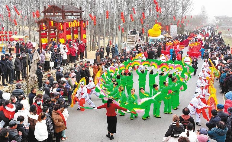 近日,位于秦岭北麓的鄠邑区持续开展民俗巡游活动,区内10个街道的群众在石井街道蔡家坡村进行展演。展演以鼓舞巡游为主,融合了民俗表演与当地文化特色,群众在参与活动的同时展示自我风采。图为鄠邑区甘亭街道的群众在进行民俗巡游(2月18日摄,无人机照片)。