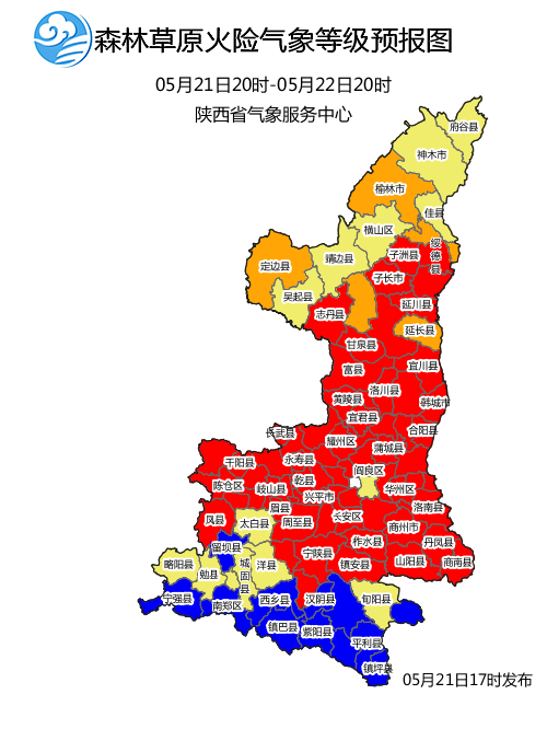 预计今天白天:全省晴天间多云。秦岭山区局地、陕南南部局地有分散性阵雨(0~5毫米),安康南部局地有中雨(5~15毫米)。陕北大部、关中北部有4级左右偏南风,阵风可达6级以上。关中平原东部局地有35℃以上高温天气。今天晚上:陕北晴天转多云,关中、陕南晴天间多云。陕北北部有4级左右偏南风,阵风可达6级以上(图1)。今日陕北大部、关中、陕南东北部森林草原火险气象等级为4~5级(高度~极高危险)(图2),需注意防范。