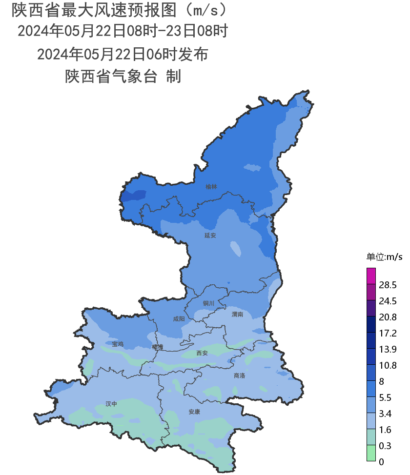 23日:陕北晴天转多云,关中、陕南晴天间多云。秦岭山区局地、陕南南部部分地方有分散性阵雨(0~2毫米)。陕北大部有4级左右偏南风,阵风可达6级以上。关中平原、陕北黄河沿线有35℃以上高温,局地可达37℃。24日:全省多云转阴天。陕北北部部分、宝鸡西部局地、汉中西部局地和安康南部局地有小雨或阵雨(0.1~3毫米)。陕北大部、关中北部、商洛有4~5级偏南风,阵风可达6~7级。关中平原有35℃以上高温,局地可达37℃。25日:全省阴天小到中雨转多云,陕北东部局地、宝鸡西部局地和汉中西部局地有大雨。全省日平均气温下降4~6℃。26日:全省多云间晴天,陕北南部局地、关中东部局地和陕南东部局地有阵雨或雷阵雨。陕南河谷地区最高气温35~36℃。27日:全省晴天间多云。陕北有5~6级偏南风。关中南部部分地方最高气温35~37℃。28日:全省晴天转多云。关中南部部分地方最高气温35~37℃。29日:全省阴天有小到中雨,关中西部局地、陕南西部局地有大雨。陕北、关中北部有6级左右偏北风,全省日平均气温下降6℃左右。30日:全省多云间晴天。31日:全省晴天间多云。后期天气趋势(6月1-4日):全省以多云间晴天气为主,部分地方有分散性阵雨或雷阵雨天气。