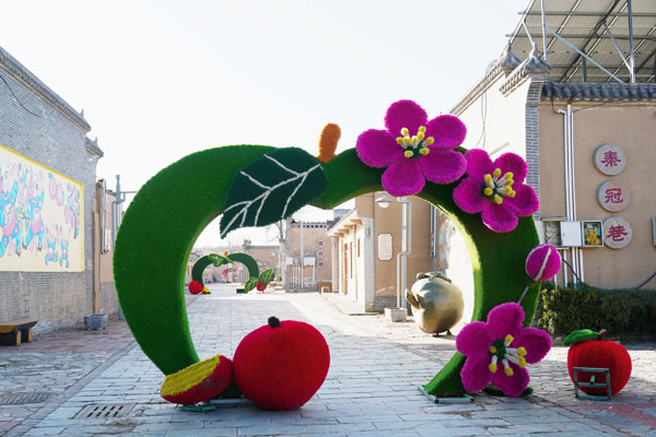 走进阿寺村,干净整洁、阡陌纵横,苹果文化步行街、苹果大讲堂、李新安纪念馆、苹果采摘观光长廊带……道路两旁绵延至山顶的千亩苹果园在蓝天的映衬下,一派欣欣向荣的场景。行走在充满苹果文化元素的步行街上,脚下的石板镌刻着苹果种植的剪纸流程,两侧小巷以“秦冠”、“富士”、“嘎啦”等苹果品种命名。