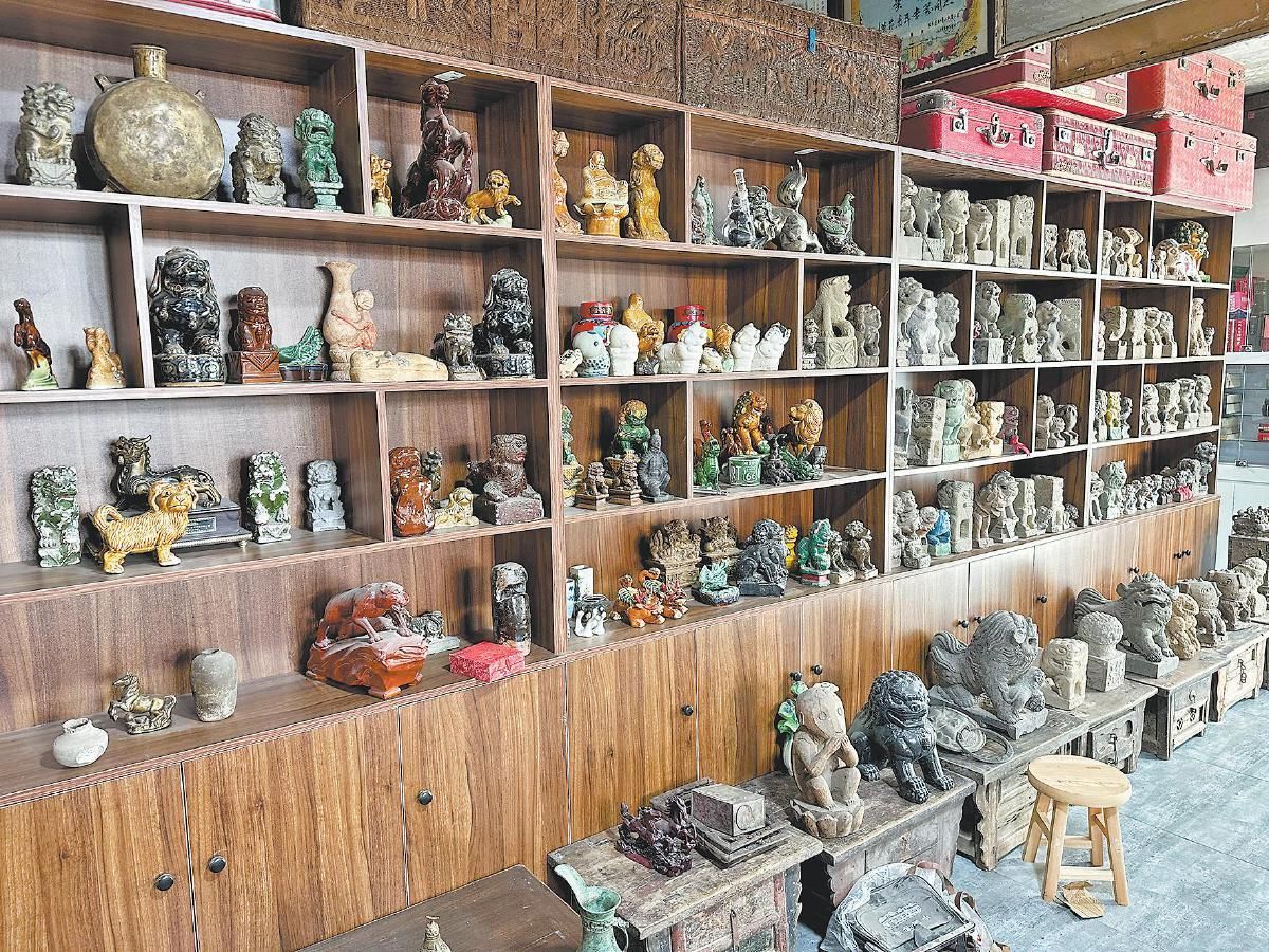 李建军先生如数家珍地向我们介绍他的藏品。他指着几大堆秤砣说,大小不等约有五百多个;他向我们介绍室内室外摆放的几百件石狮子等石雕作品中,秦、汉、唐、宋、元、明、清各个时代的特征;他也向我们介绍了各种红色藏品。他把收藏的许多毛主席塑像,整齐地摆放在高处,体现着他对人民领袖的敬爱……