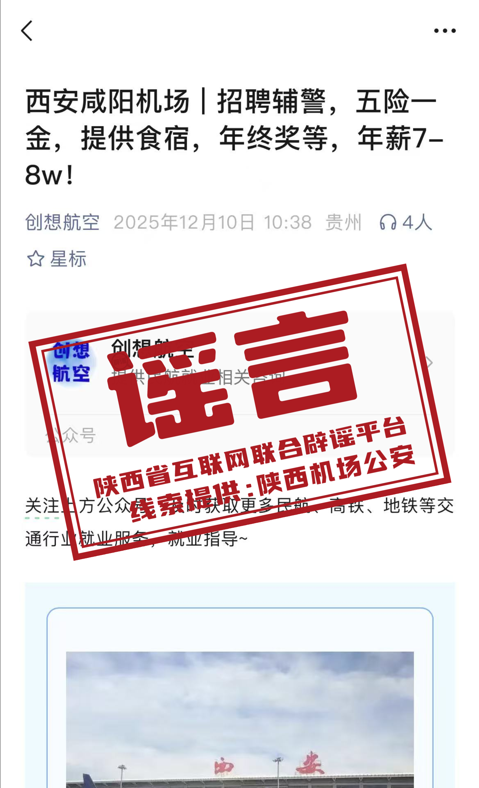 对此,陕西机场公安郑重声明:近期并无招聘辅警计划,网传有关招聘信息均属谣言。