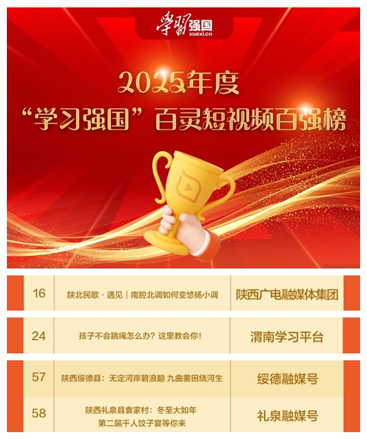 2026年2月,“学习强国”学习平台发布《2025年度“学习强国”百灵短视频百强榜》,陕西4部作品上榜。每一部作品,既是视听艺术的呈现,也是正向价值的传递,更是时代印记的定格。