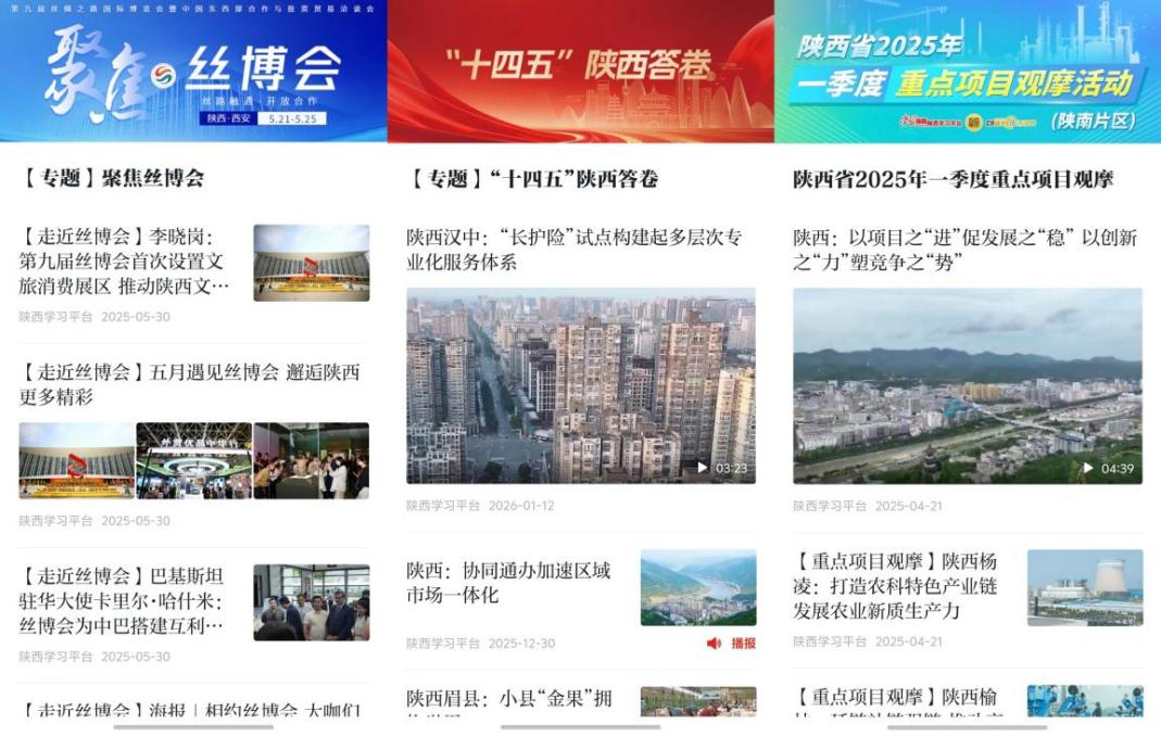 从陕西两会到重点项目观摩,从丝博会到丝路万里行;从“十四五”陕西答卷到“十五五”建言献策——陕西学习平台始终聚焦高质量发展与经济建设主战场,以权威内容讲好陕西故事,以主流声音凝聚奋进力量,为提振信心、汇聚合力贡献强国担当。