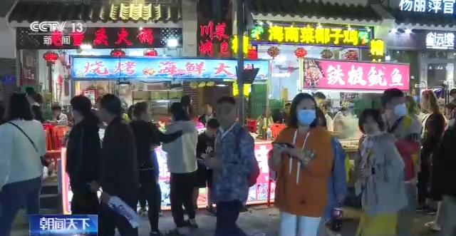 假期里,旅游城市的美食聚集区也热闹起来。在海南,游客们赏夜景尝美食,本地海鲜、水果等特色风味颇受大家喜爱。