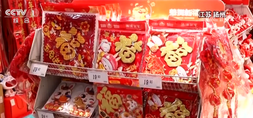 年味儿还在红红火火的春联和福字贴中。在江苏扬州某大型超市,前来采购年货的市民熙熙攘攘,金兔、福兔、玉兔等“兔元素”福贴、窗花、灯笼吸引了不少人选购。