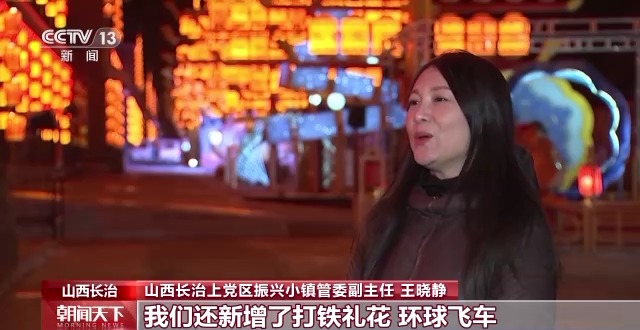 山西长治上党区振兴小镇管委副主任 王晓静:除了往年的民俗非遗表演之外,我们还新增了打铁礼花、环球飞车、振兴村晚文艺表演等活动,让群众和游客一起感受兔年的喜庆气氛。