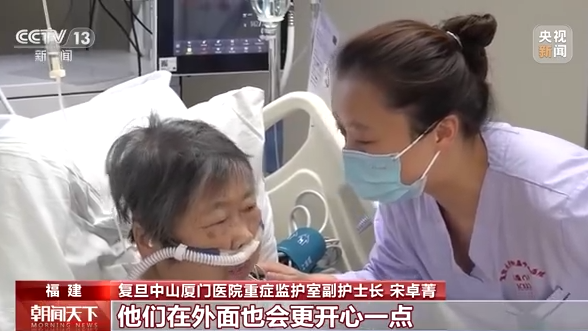 复旦中山厦门医院重症监护室副护士长 宋卓菁:你能吃多少就吃多少,你能吃多一些他们在外面也更开心一点,他们也能安心了,是不是。你老伴也来看你了,待会你和他们在外面视频讲讲话。
