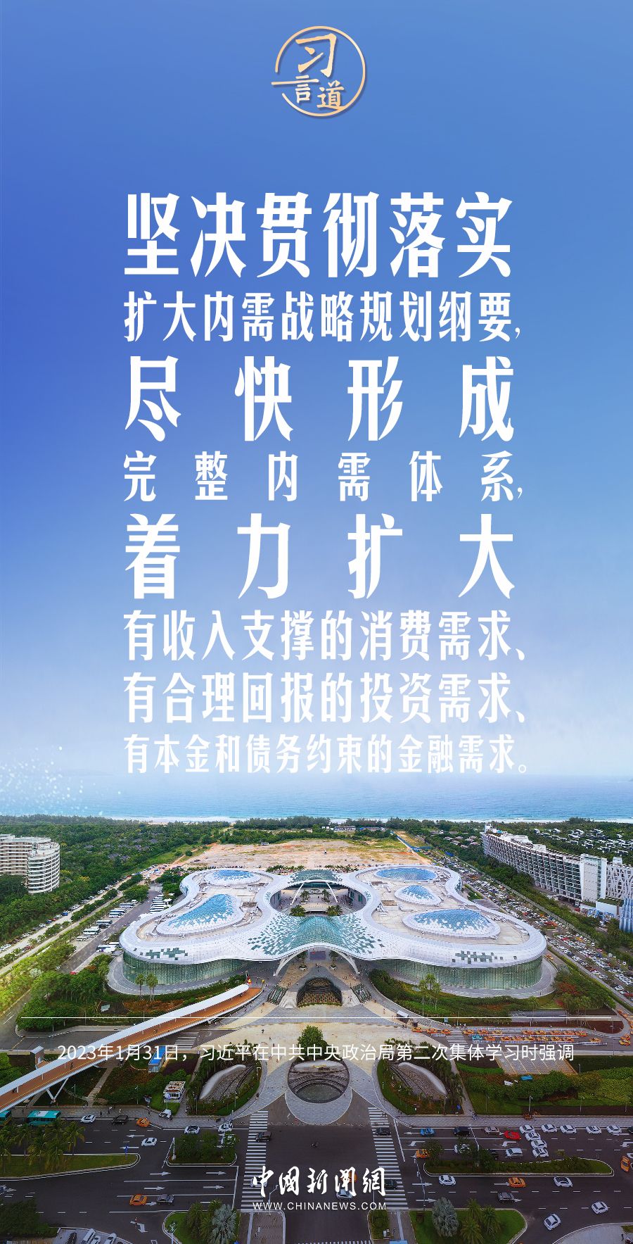 习言道|扭住扩大内需这个战略基点 来源:中国新闻网 2023-02-05 12:48 “着力扩大国内需求”是2023年中国经济工作的重点任务之一。党的十八大以来,习近平总书记多次就扩大内需作出重要论述。