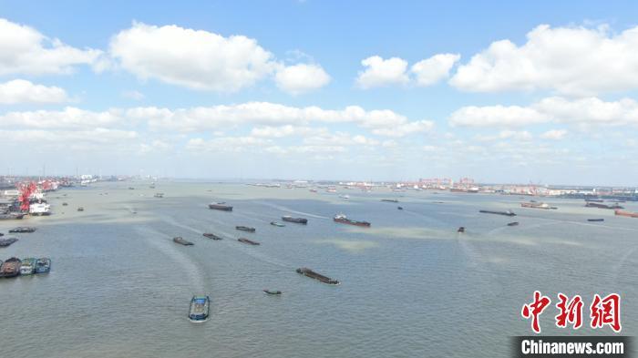 空中俯瞰,长江江阴段“百舸争流”。 张宪 摄