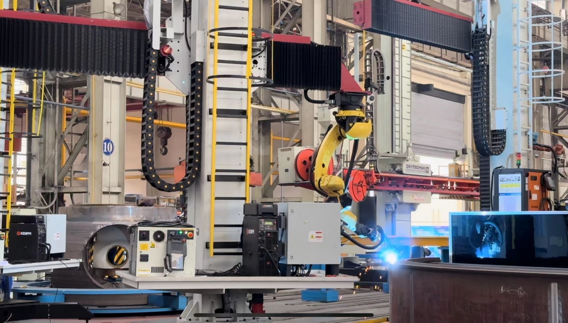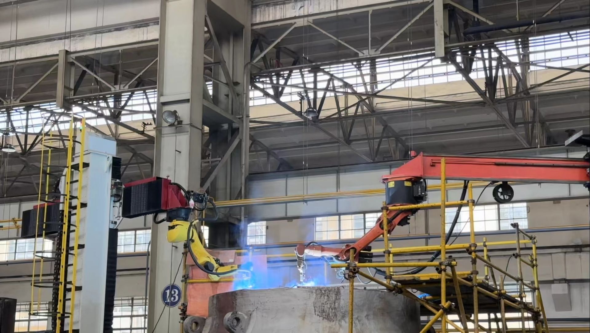 东方电机有限公司重跨车间内的机器人正在焊接作业。中国经济网记者朱晓航/摄。