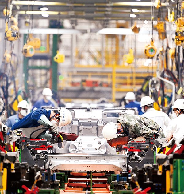 2023年2月2日,在广西柳州汽车城新能源产业园,工人们在一家新能源汽车企业车身车间里忙碌。 人民图片 黎寒池/摄