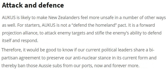 新西兰“最新消息”网站:“奥库斯”协议让新西兰人感到更不安全,因为这是一个带有前瞻性的联盟,旨在攻击“敌方”目标。而永远禁止澳大利亚核潜艇进入新西兰港口“将是一件好事”。
