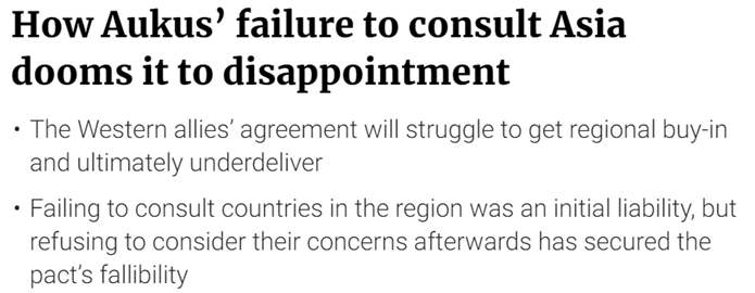 马来西亚战略分析专家班恩评论认为,“奥库斯”这个以美国为首的英语国家联盟无视亚太国家的意见,将自己置于多边约束和外部监督之上,“很难得到亚太地区的认同,最终会算盘落空”。
