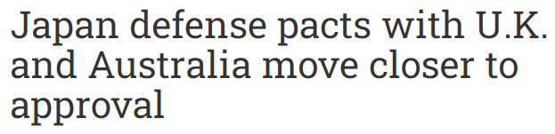 去年1月和今年1月,日本已先后与澳大利亚和英国签署了便于日本自卫队与两国军队共同训练的《互惠准入协定》。