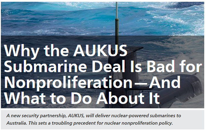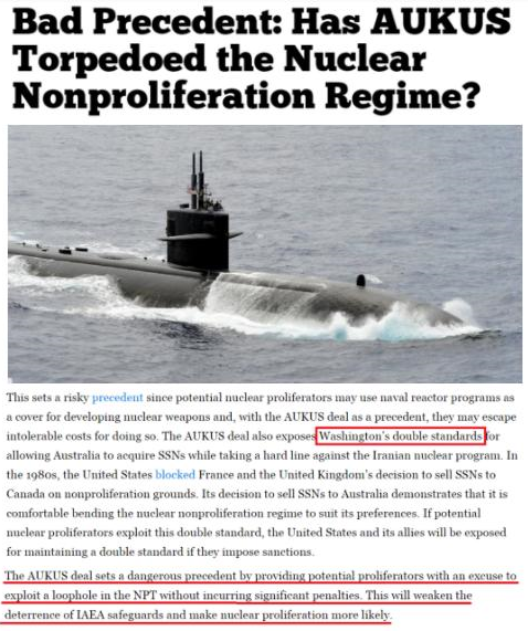 卡内基国际和平基金会核政策项目联合主任詹姆斯·阿克顿发表评论文章认为,美英向澳大利亚提供核潜艇的做法对国际核不扩散体系的影响是消极和严重的,“开了一个令人不安的先例”。