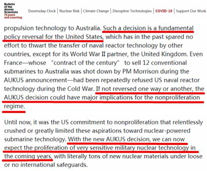 在核领域具有权威影响的《原子科学家公报》杂志刊文警告,随着澳大利亚成为世界上第一个拥有核潜艇的无核武器国家,可以预见,“非常敏感的军事核技术未来几年将在宽松或没有国际保障的情况下发生扩散”。