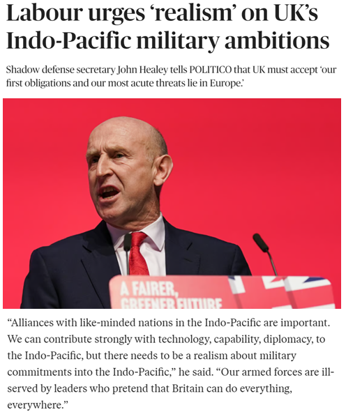 针对英日的反常举动,英国工党的影子国防大臣希利接受美媒采访时认为,英国在亚太寻求盟友时如果涉及军事投入,应采取现实主义态度。“妄称英国无所不能、无处不在,对我们的军队没好处”。