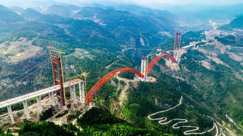 作为渝湘复线高速公路的重要部分——双堡特大桥主拱今天成功合龙。双堡特大桥位于重庆市武隆区境内,合龙后的主拱肋犹若一双绚丽的彩虹,与青山绿水交相辉映、浑然天成。