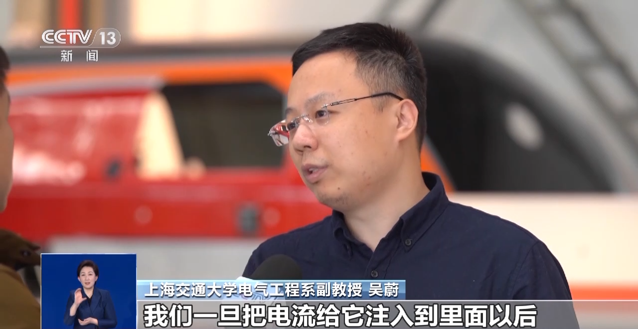 上海交通大学电气工程系副教授 吴蔚:它会带来一些额外的好处,一个是车载的高温超导磁体可以使用低成本的制冷方式,来维持车载磁体零电阻传输大电流的优点。另外,它虽然是一种电磁铁,但是一旦给它注入电流,它是可以在完全没有电力供应的状态下工作的。