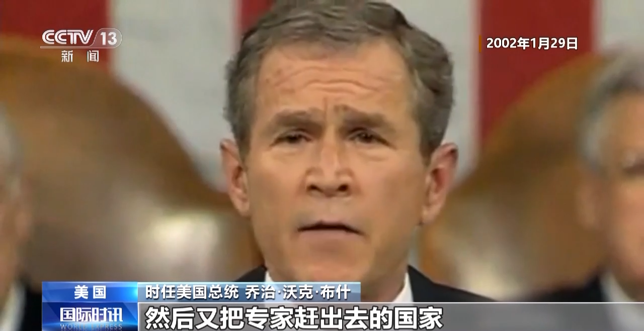 时任美国总统 乔治·沃克·布什:伊拉克是一个多年来秘密发展炭疽、神经毒气和核武器的国家。这是一个同意接受(联合国)武器核查,然后又把专家赶出去的国家。