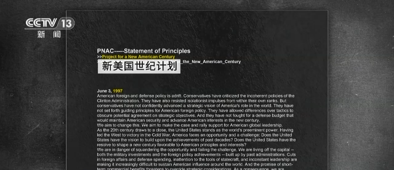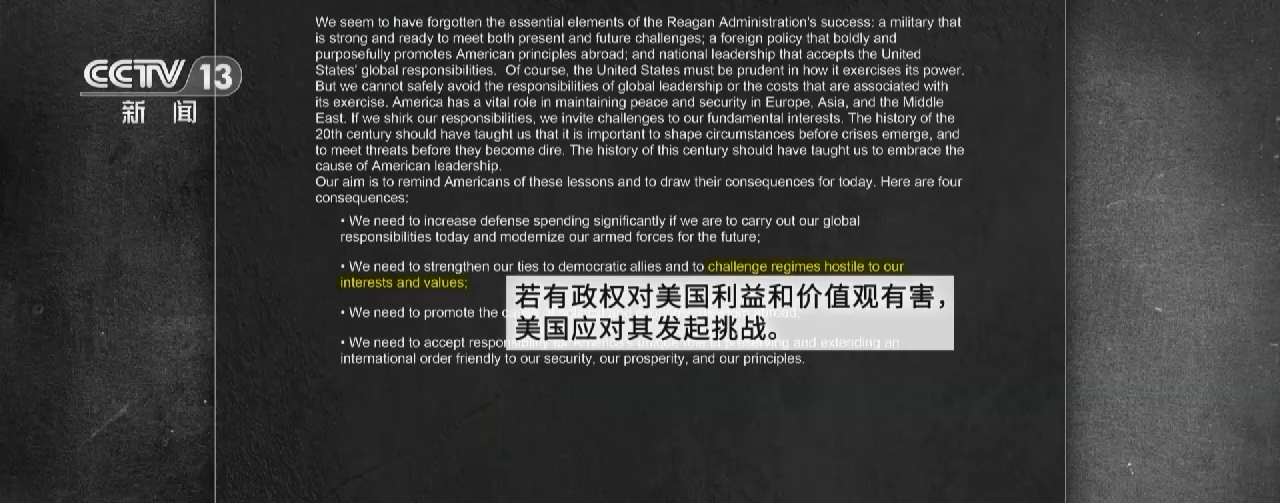 该组织在声明中,明确指出“作为当今世界的唯一超级大国”,美国应扩大和保持“全球霸权”。“若有政权对美国利益和价值观有害,美国应对其发起挑战”。