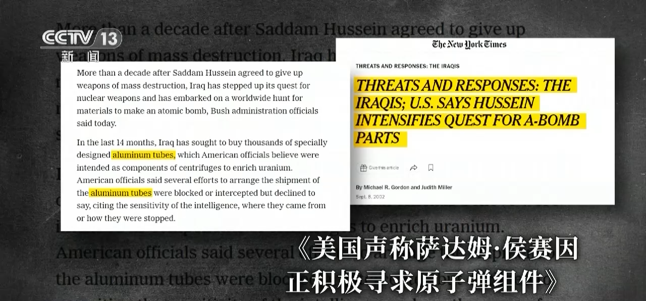 2002年9月,有匿名官员故意将这一消息透露给了《纽约时报》。后者以《美国声称萨达姆·侯赛因正积极寻求原子弹组件》为题,对这一未经证实的情报大肆炒作。几个小时后,白宫政客迅速跟上。