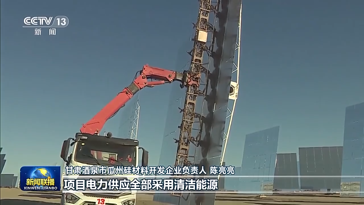 甘肃酒泉市瓜州硅材料开发企业负责人 陈亮亮:项目电力供应全部采用清洁能源,用清洁能源生产多晶硅,再用多晶硅生产光伏组件,再用光伏组件生产清洁能源,形成闭环。