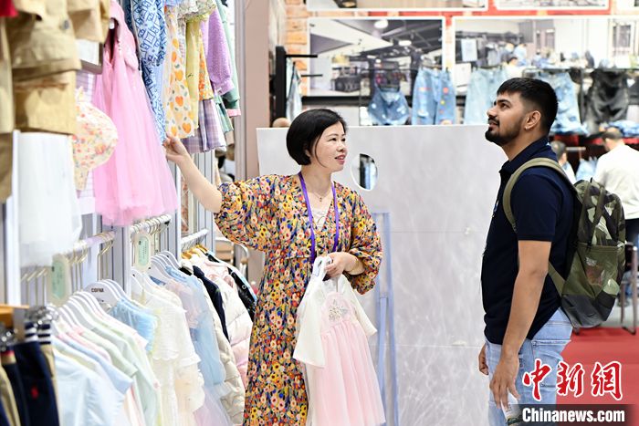 图为5月1日,广东省广州市,杭州市粮油食品土畜产进出口有限公司工作人员向海外采购商介绍童装纺纱裙。 中新社记者 陈骥旻 摄