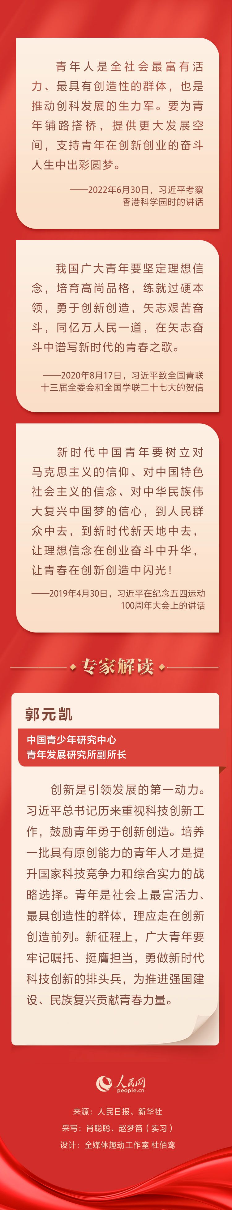 激扬青春|“让青春在创新创造中闪光!” 习近平寄语青年 来源:人民网 2023-05-05 13:07 “青年是祖国的前途、民族的希望、创新的未来。”一直以来,中共中央总书记、国家主席、中央军委主席习近平鼓励青年追求梦想,让青春在创新创造中闪光。人民网邀请专家进行解读。