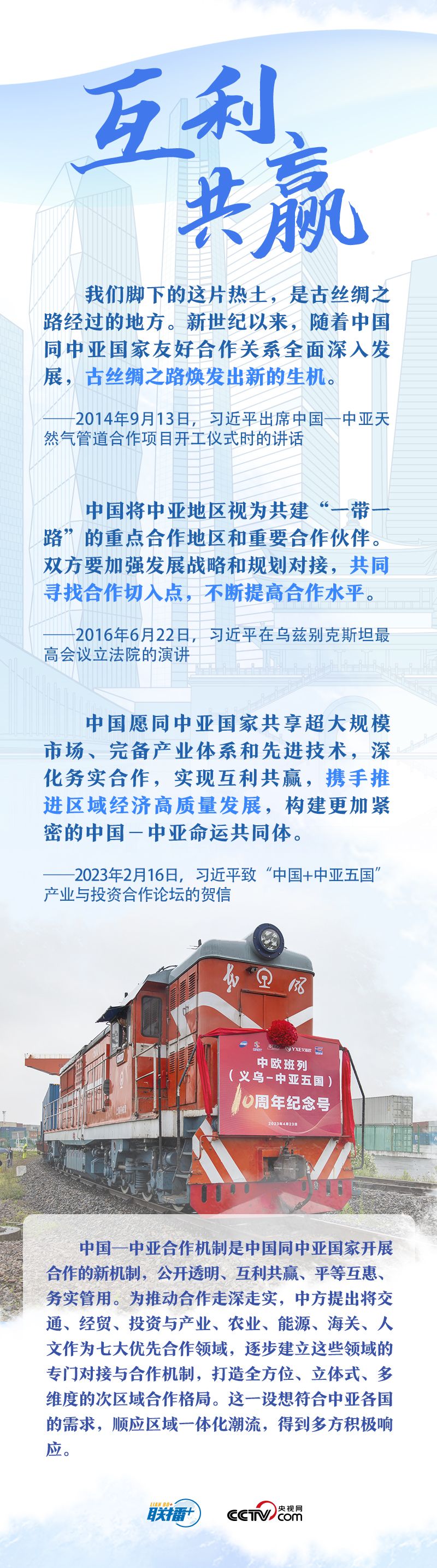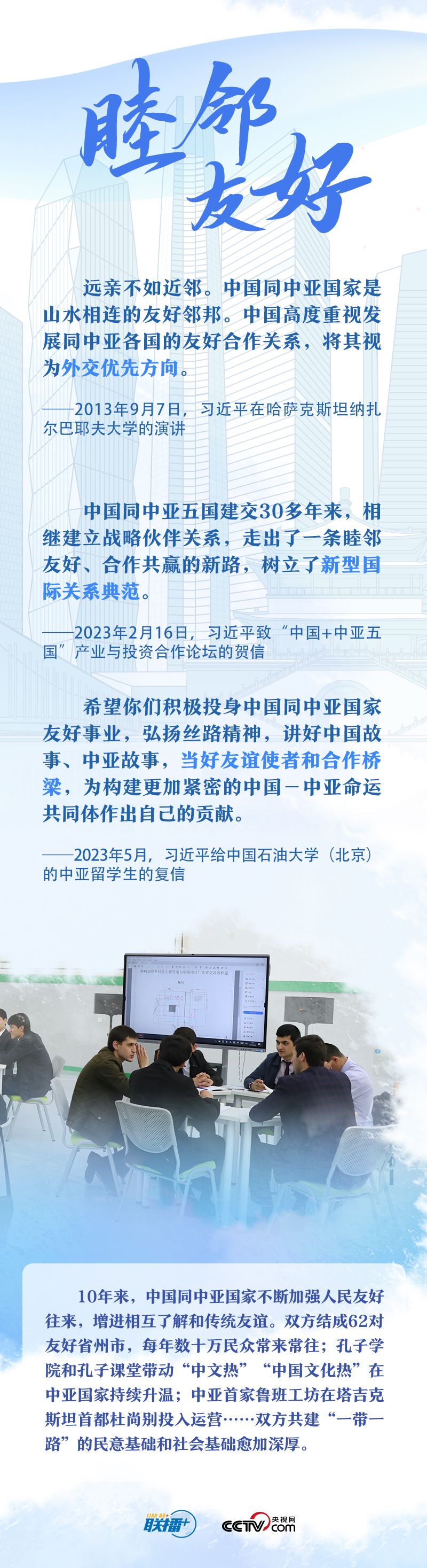 习主席把中国同中亚五国合作的成功密码总结为“相互尊重、睦邻友好、同舟共济、互利共赢”。他强调,这四项原则是在合作中积累的宝贵经验和共同财富,是中国同中亚国家关系行稳致远的政治保障,也是中国同中亚国家友好交往继往开来的力量源泉。央视网《联播+》与您一起学习。
