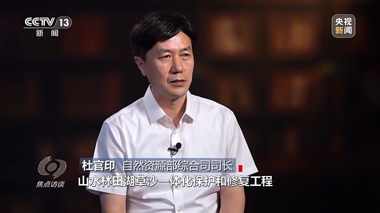 自然资源部综合司司长 杜官印:我们会同相关部门组织实施了51个山水林田湖草沙一体化保护和修复工程,已经累计完成治理面积8000多万亩,山水林田湖草沙一体化保护和修复工程,也入选了联合国首批十大世界生态恢复旗舰项目。