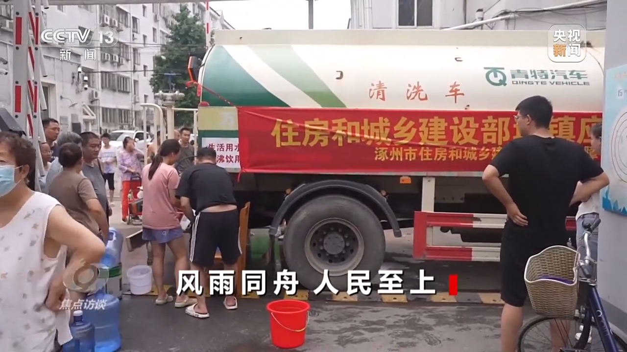 河北涿州的住建部门24小时奋力工作,逐步启动下辖应急备用水源井,全力保障居民基本生活用水。在抓紧开启应急备用水源井的同时,住房城乡建设部调派国家供水应急救援中心的8辆应急净水车,以及水质监测车也已抵达涿州。同时,由河北全省协调来的12辆运水车,也在为大家送水,基本满足居民日常用水需求。