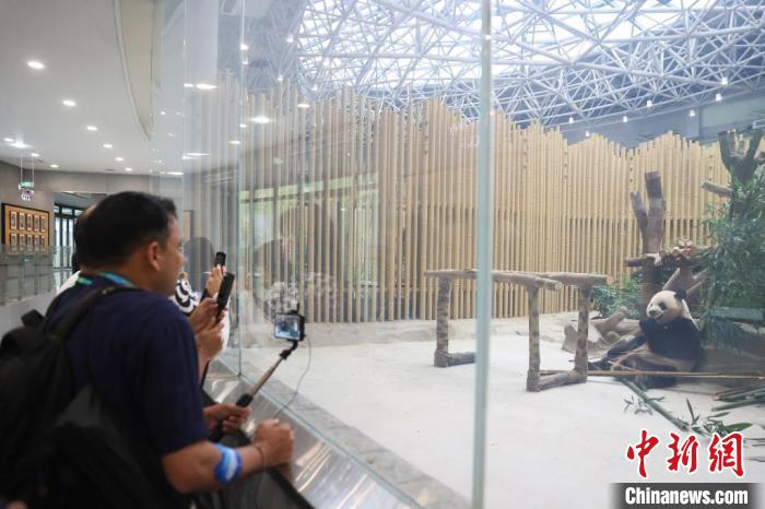 8月6日,四川成都,一名尼泊尔记者用手机拍摄第31届世界大学生夏季运动会吉祥物“蓉宝”的原型大熊猫“芝麻”。当日,不少外国媒体记者走进成都大熊猫繁育研究基地参观采访。 中新社记者 刘占昆 摄