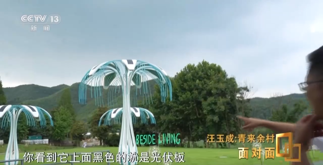 汪玉成:你看到它上面黑色的就是光伏板,通过白天吸收光,晚上会自动亮起灯光,有音乐播放,也是一种艺术装置。