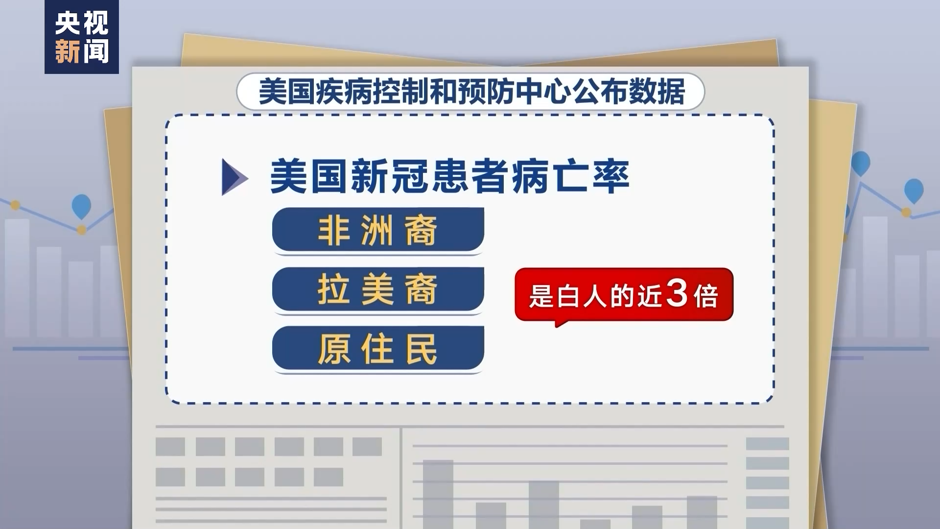 美国疾病控制和预防中心公布的数据显示,美国新冠患者中,非洲裔、拉美裔和原住民的死亡率是白人的将近3倍。美国劳工部数据显示,自疫情暴发后,美国非洲裔成年人失业率远高于白人。