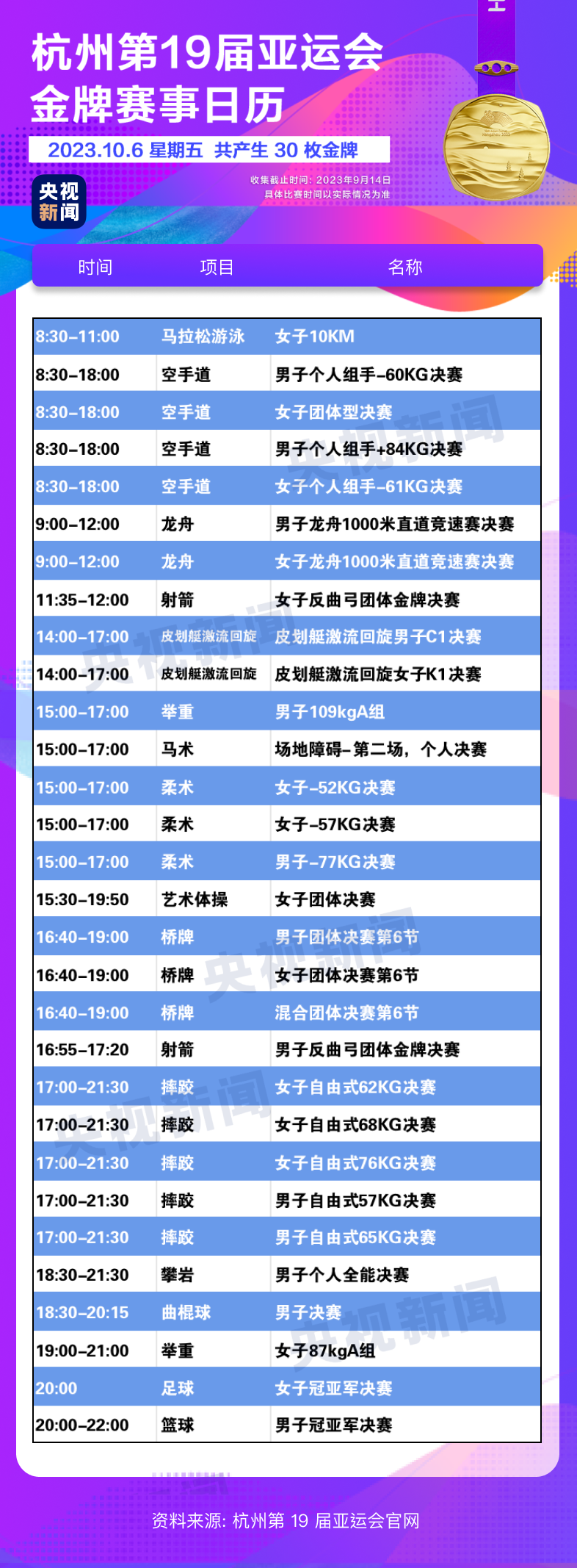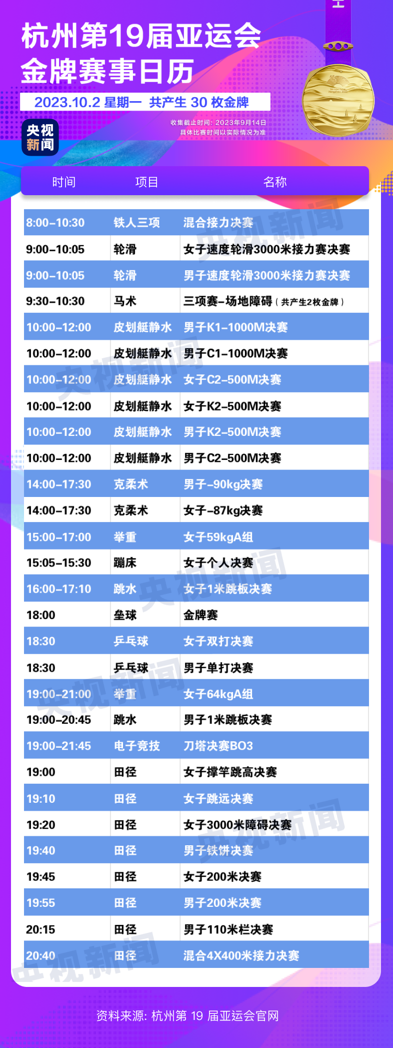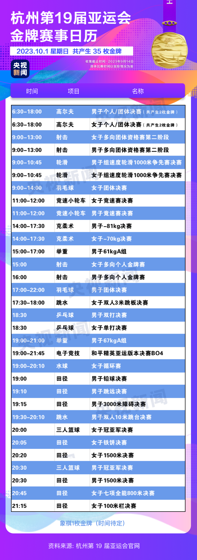 杭州亚运会精彩赛事别错过!快收藏这份金牌观赛日历
