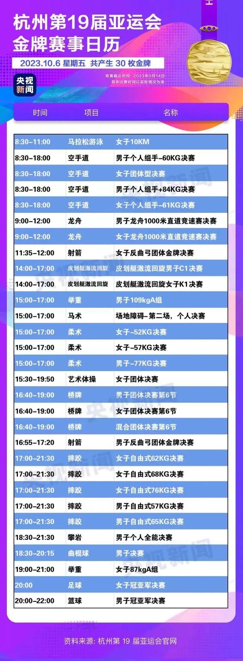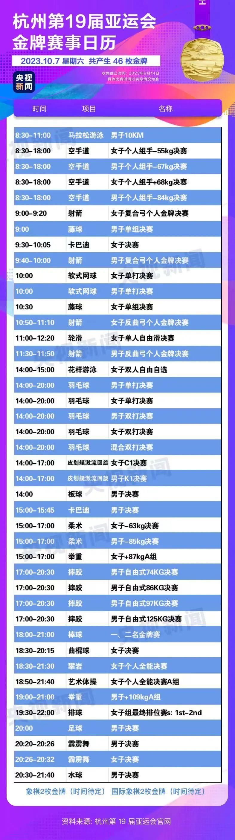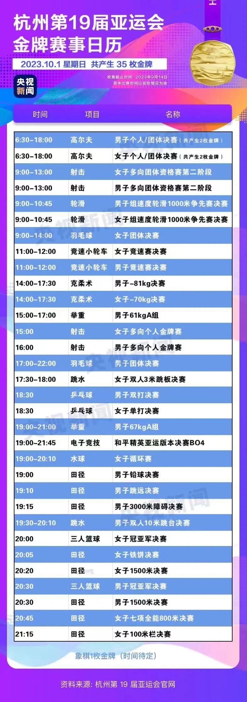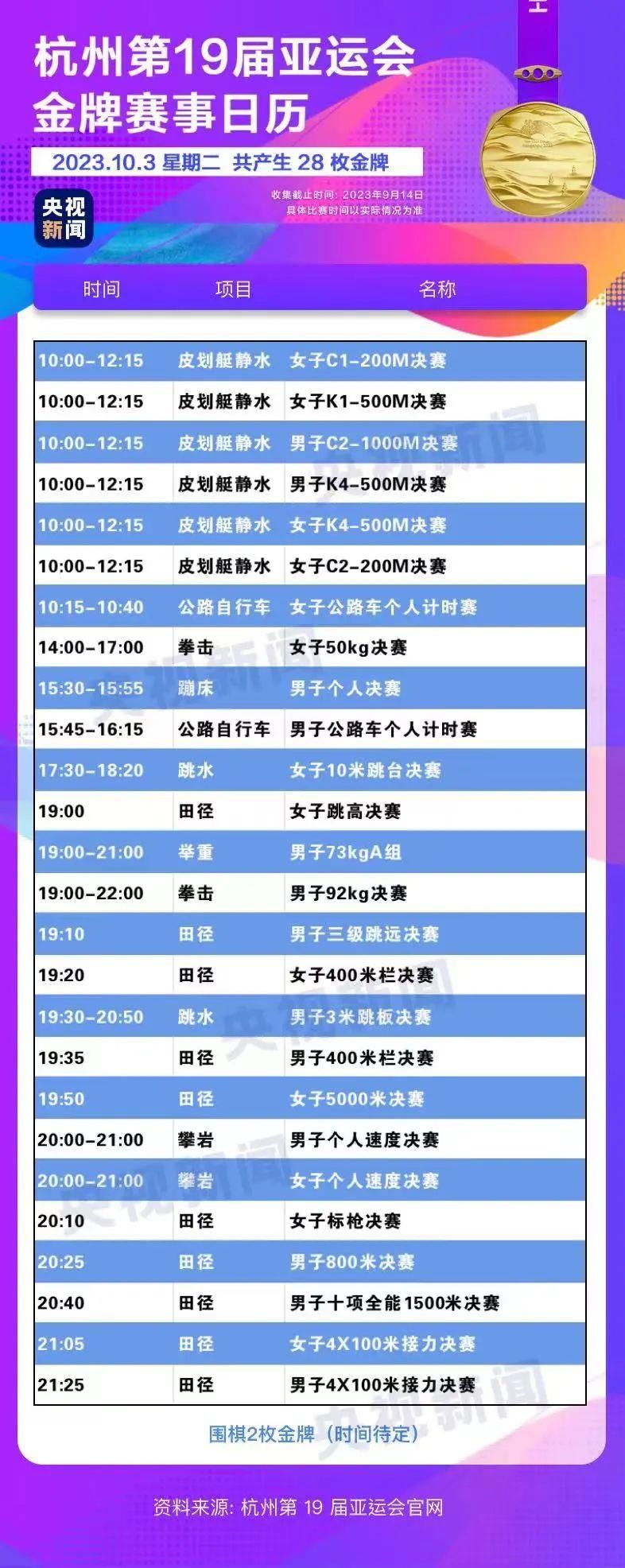 最后,小编还为你准备了一份杭州亚运会金牌赛事日历,日历里包含所有481枚金牌产生的时间。滑动手指,看看你关注的比赛在哪天举行。
