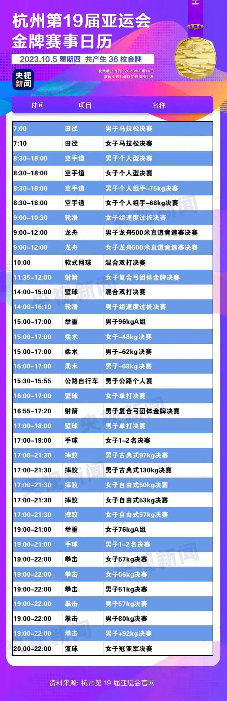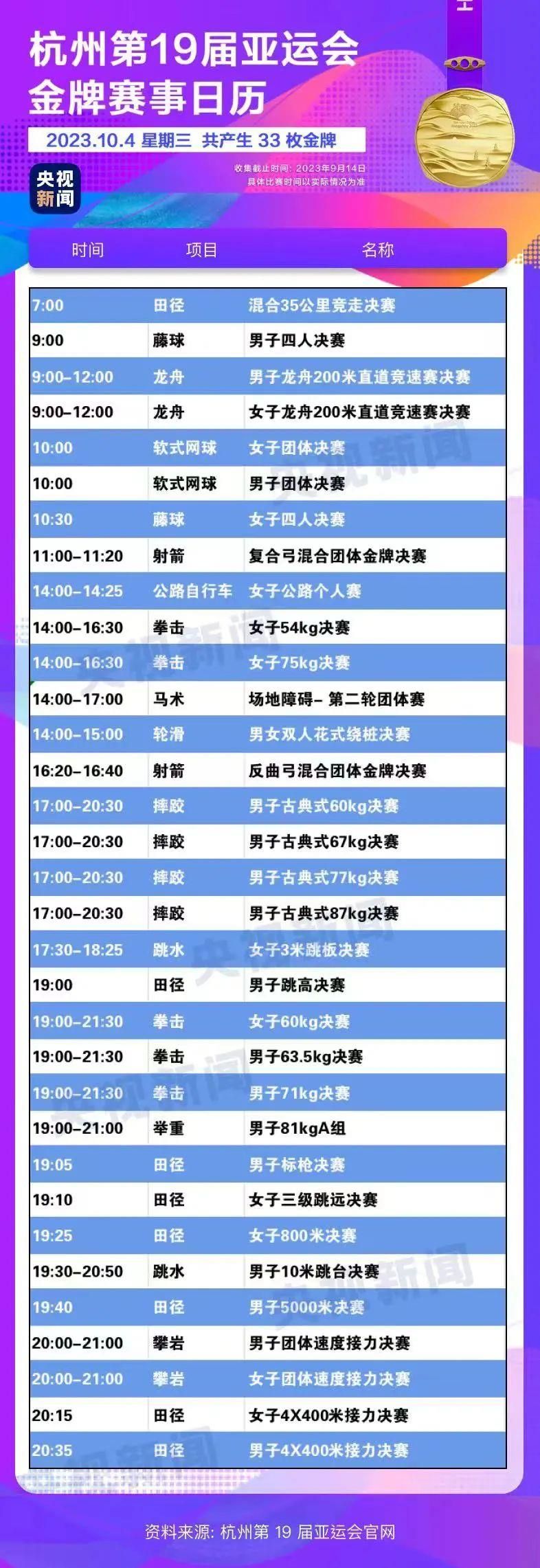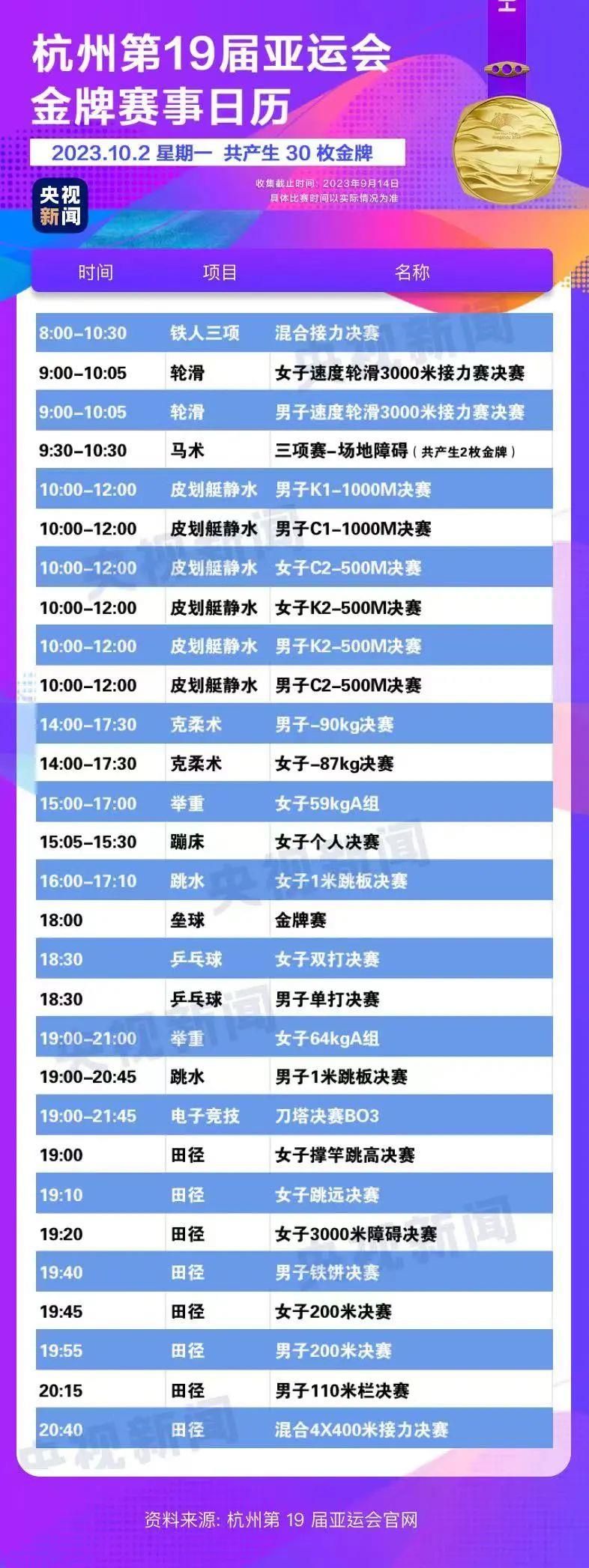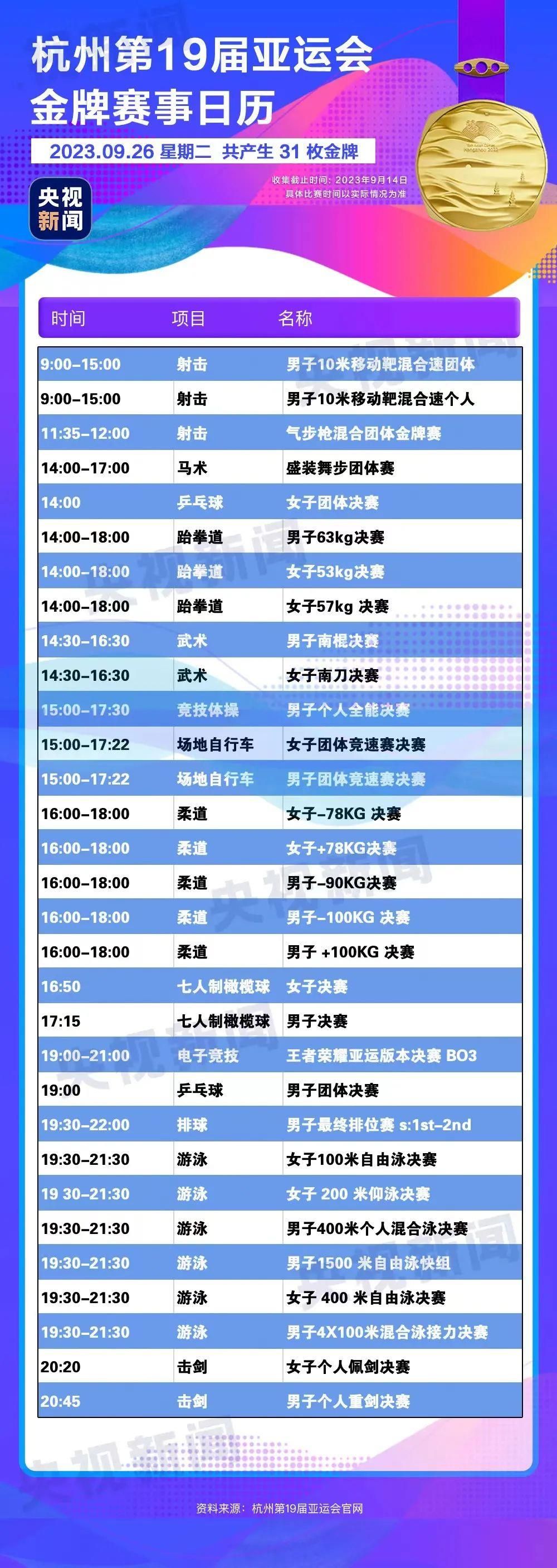 最后,小编还为你准备了一份杭州亚运会金牌赛事日历,日历里包含所有481枚金牌产生的时间。滑动手指,看看你关注的比赛在哪天举行。