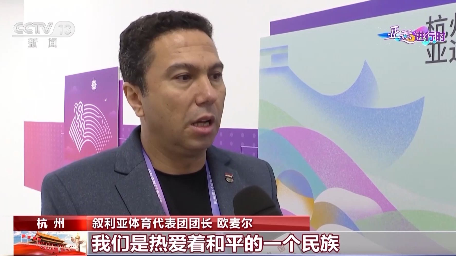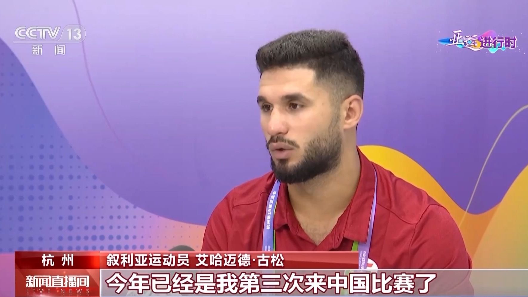 叙利亚运动员 艾哈迈德·古松:今年已经是我第三次来中国比赛了。当我走在街上,我可以看到很多人向我问好,欢迎我们来到这里。而且一旦我们需要帮助,很多人都来为我们提供帮助。来到这里就像回家一样,而且哪里都是那么干净美丽,场馆也是我见过的最棒的场馆,谢谢中国给亚洲带来了一场如此精彩的亚运会。