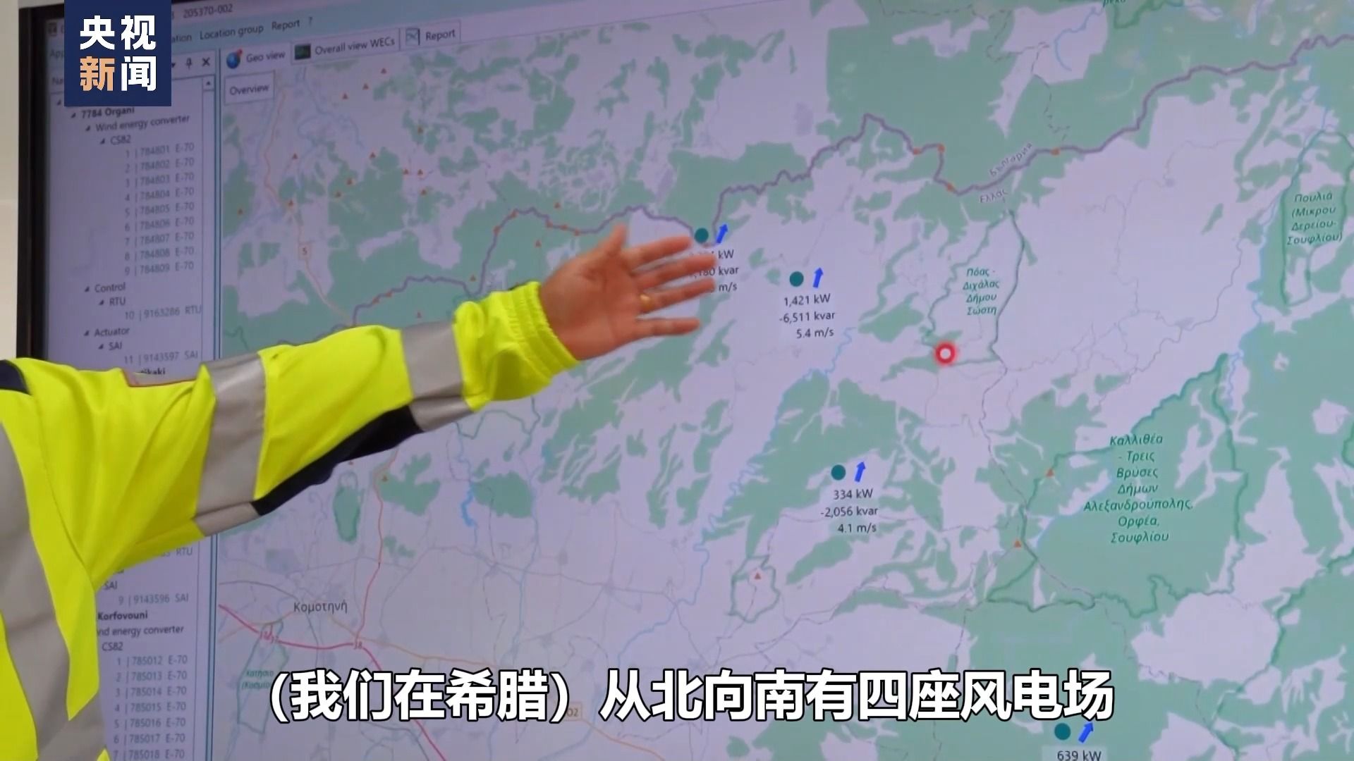 国家能源集团欧洲新能源公司安全总监 乌巴特:我们在希腊从北向南有四座风电场,这些数据都是实时的,可以看到我们现在风电场的运行情况。今天的风很不错,很适合我们发电。